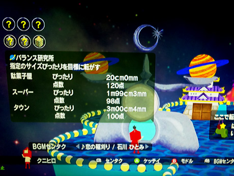 ジョウズニ オ買イモノ - 一定の金額内でアイテムを集めてできた塊のサイズを競う。