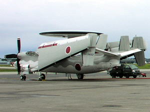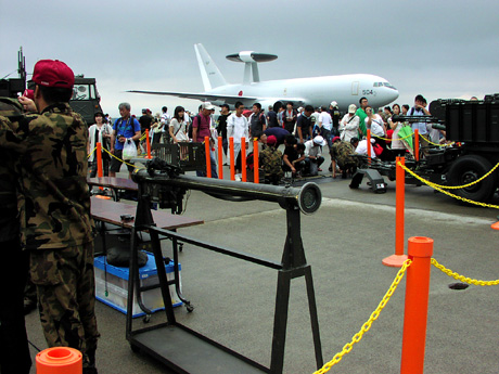 手前がFIM-92スティンガー携帯地対空誘導弾、奥の飛行機がE-767AWACS。