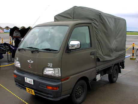 国防色の軽トラック。たぶん三菱ミニキャブ。