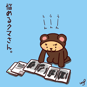 車のカタログ見比べ、悩めるクマさん('д')