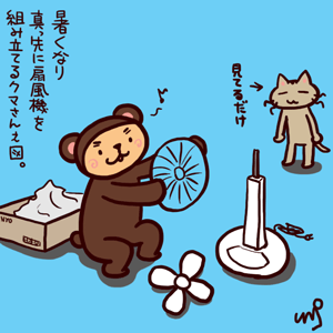 何より真っ先に扇風機を組み立てるクマさん。