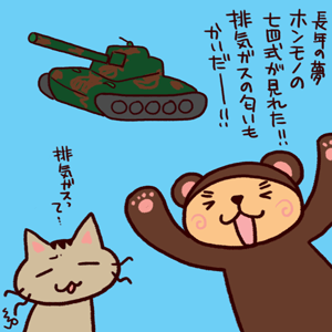 74式戦車が動き出すとこでクマさん大興奮で動画撮ってた。