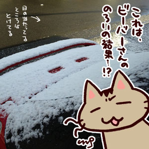 日の当たる場所は融けているけど積もってる。